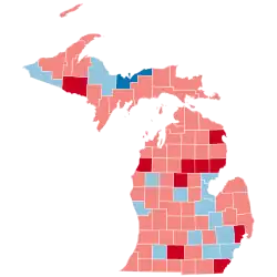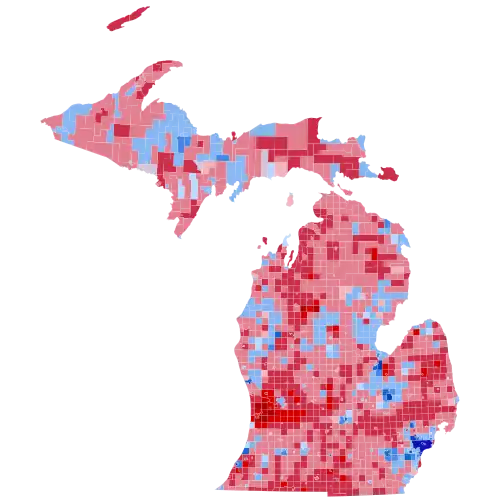 Kerry won Michigan with 51.2% and by a margin of 3.4%. While a reduced margin with respect to Gore's in 2000, the state trended Democratic in 2004 relative to the nation.[8] Bush won a majority of the state's counties and congressional districts, holding Kerry to only 15 counties (whereas Gore had carried 24). But he underperformed previous Republicans in two large suburban counties that had recently been Republican strongholds in the state, Oakland and Macomb Counties. Kerry narrowly held onto Oakland County, which has a more white-collar populace and had voted Republican in every election from 1940 through 1992 save 1964, and had voted to re-elect Bill Clinton in 1996 by only 4.3%. Bush did flip the more blue-collar Macomb County, which Gore had become the second Democrat to carry after a twenty-year run of voting Republican from 1972 through 1992, but he carried it by only 1.4%, making it still slightly bluer than the nation. Meanwhile, Kerry maintained the traditional Democratic domination of Wayne County, winning about the same 69% vote share in it that Gore had won in 2000. Michigan had voted Republican in every election from 1972 through 1988, in all of which Oakland and Macomb had given the Republican a healthy margin.