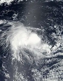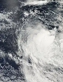The second disturbance was first classified by the MFR on October 12 about 1,575 km (979 mi) east of Diego Garcia.[11] The system had enough of a circulation and associated convection, and proceeded southwestward for its duration.[12] After the convection consolidated more and developed curved rainbands, the MFR upgraded the system to a 55 km/h (34 mph) tropical depression on October 14.[13] This period of organization occurred during a brief decrease in wind shear. At 12:00 UTC on October 14, the JTWC classified the system as Tropical Cyclone 01S, estimating peak 1 minute winds of 75 km/h (47 mph).[11] Increasingly unfavorable conditions caused the convection to diminish.[14] Late on October 15, both the JTWC and MFR discontinued advisories due to the increasing disorganization of the disturbance.[11] The circulation remained well-organized but devoid of convection,[15] and the MFR last monitored the center on October 21.[16]