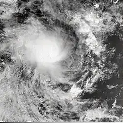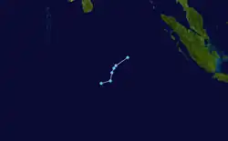 At the end of March, an active phase of the Madden–Julian oscillation caused an increase in convection over the northeastern portion of the basin. A low-pressure area formed on April 1 in the neighboring Australian basin, although the system soon after moved northwestward to cross 90º E. The low meandered for several days, unable to intensify much due to insufficient moisture in the region.[3] On April 6, the MFR designated the system as Tropical Disturbance 13, although the agency discontinued advisories on the next day.[35] On April 7, the low crossed back into the Australian basin, only to turn to the southwest on April 10, steered by a ridge to the southeast.[3] During this time, the system passed about 185 km (115 mi) northwest of the Cocos Islands. On April 12, the JTWC designated the system as Tropical Cyclone 12S.[35] On the same day, the system intensified into a tropical depression, after the convective structure improved amid favoring conditions.[3]