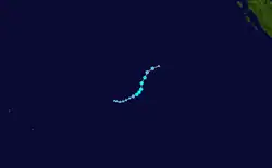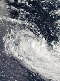 In the beginning of March, the monsoon was active to the northeast of Madagascar, the first time during the season that such active convection persisted northeast of the island. The broad system had two foci of low pressure; one was located northeast of Madagascar near St. Brandon, and the other was to its south closer to Réunion. The structure resembled a monsoon depression, but as the two low-pressure areas consolidated, they became more distinct. On March 2, the system that would become Diwa originated out of the southern low, and both systems continued to interact until Diwa absorbed the other disturbance. The wind field was large and asymmetrical, ranging 2,000 km (1,200 mi) in diameter, and there was little convection near the centers.[3] Despite the lack of organization, the Meteorological Service of Mauritius named the system Tropical Storm Diwa on March 3 due to the threat to the Mascarene Islands, as well as the presence of gale-force winds. The structure slowly evolved into that of a tropical cyclone as the convection concentrated. On March 4, Diwa passed northwest of Réunion, still disorganized with much of the convection to the south.[3] That day, the JTWC initiated advisories on the system as Tropical Cyclone 16S. The storm continued slowly to the southwest at first, until it turned to the southeast on March 6 while rounding the ridge.[32] Despite accelerating into an area of cooler waters, Diwa's structure became much more like a tropical cyclone on March 8.[3] The MFR estimated peak 10 minute winds of 110 km/h (68 mph),[33] making it a severe tropical storm,[3] and the JTWC estimated peak 1 minute winds of 100 km/h (62 mph).[33] Diwa quickly transitioned into an extratropical cyclone as it interacted with a cold front to the south,[32] completing the transition by March 9. The circulation gradually lost its definition, dissipating on March 11.[33][3]