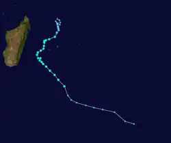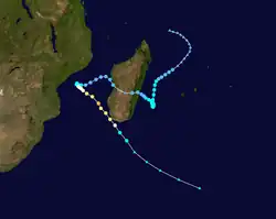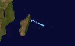 Moving southeastward in the flow of the trough, the small storm began weakening on February 20 due to strong northwesterly wind shear, which caused the convection to dwindle over the circulation. That day, the storm passed just 80 km (50 mi) north of Mauritius, by which time the center was exposed and the intensity had dropped to tropical depression status. It turned back to the northwest, steered by the low-level trade winds and following its previous path.[3] Late on February 20, the JTWC discontinued advisories,[30] and three days later, the circulation dissipated off the east coast of Madagascar.[3]
