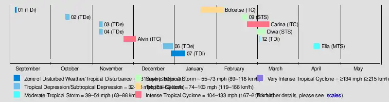 A series of four short-lived systems occurred from September to November in the northeastern portion of the basin. These were followed by the first named storm – Alvin – which was renamed after it crossed from the Australian region as Tropical Cyclone Bertie in late November. After another short-lived disturbance in late December, there was a tropical disturbance in the Mozambique Channel in January that killed 26 people when it brought heavy rainfall to Mozambique. Later in the month, Tropical Cyclone Boloetse took an erratic track across Madagascar, killing six people when it brushed the island's southwest coast. In February, there was a small, short-lived unnamed tropical storm that presented difficulties to warning agencies in determining its structure. Intense Tropical Cyclone Carina was the strongest system of the season, attaining peak 10 minute winds of 205 km/h (127 mph) in the open waters of the eastern portion of the basin. Sprawling Tropical Storm Diwa brought six months' worth of rainfall to the drought-ridden island of Réunion, reaching 2,943 mm (115.9 in) in the mountainous peaks. The rains led to flooding and landslides that killed 10 people directly or indirectly. Two of the deaths occurred when a saturated cliff collapsed onto a coastal road. The final storm, Elia, dissipated on April 17 after previously entering from the Australian basin.