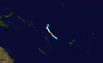 The FMS subsequently estimated during October 24, that the system had peaked as a Category 4 Severe Tropical Cyclone with 10-minute sustained wind speeds of 175 km/h (110 mph), while it was located about 220 km (135 mi) to the east of Vanua Lava in northern Vanuatu.[5][6] The JTWC also estimated during October 24, that the system had peaked with 1-minute sustained wind speeds of 215 km/h (135 mph), which made it equivalent to a category 4 hurricane on the Saffir-Simpson hurricane wind scale.[7] Over the next day the system maintained its peak intensity as it moved south-eastwards, before it turned westwards during the next day towards Vanuatu and rapidly weakened after it moved into an area of cooler sea-surface temperatures and strong vertical wind-shear.[5][6][10] As a result, during October 26, The FMS and JTWC both reported that the system had weakened into a tropical depression, before the systems remnants were last noted by the FMS during October 28.[5][12] On the Santa-Cruz Islands of Utupua and Vanikolo some minor tree damage was reported, while extensive damage to food crops occurred at Tikopia.[5][10] However, Radio New Zealand reported that overall damage at Tikopia was considered to be light given the circumstances.[10] Strong and gusty winds, rough seas and moderate to heavy swells were reported within the eastern Vanuatuan islands, however, no significant damage was reported within the islands.[5][10]