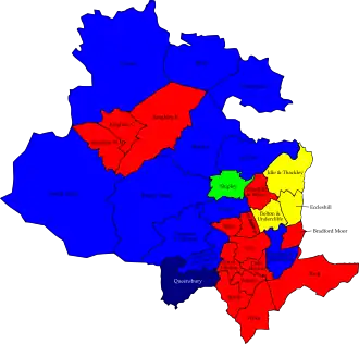 ![]() Map of the 2006 Bradford council election results. Labour in red, Conservatives in blue, Liberal Democrats in yellow, BNP in dark blue and Greens in green. | ||||||||||||||||||||||||||||||||||||||||||||||||||||||||||||||||||||