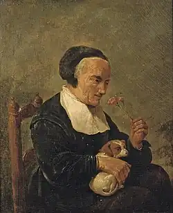 NK3086 | Navolger van D. Teniers II | Zittende vrouw met hond en anjer Archived 2020-10-15 at the Wayback Machine | 1964 | non-museum institution |
