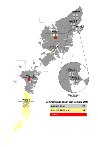 Elections to Comhairle nan Eilean Siar (Western Isles council) were held on 3 May 2007, the same day as the other Scottish local government elections and the Scottish Parliament general election. The election was the first one using 9 new wards created as a result of the Local Governance (Scotland) Act 2004,[1] each ward elected three or four councillors using the single transferable vote system form of proportional representation. The new wards replaced 31 single-member wards which used the plurality (first past the post) system of election.