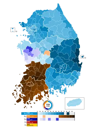 South Gyeongsang 843,662 55.0 189,463 12.4 329,486 21.5 73,893 4.8 82,645 5.4