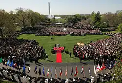 The Pope was formally received at the White House on April 16. Over 9,000 people gathered on the South Lawn of the White House, including thousands of members of the public who got free tickets in a lottery-type drawing, and another 4,000 without tickets to the ceremony lined the streets around the White House to see his motorcade.[5] The crowd sang "Happy Birthday" to the Pope, who turned 81 years old that day. The Pope addressed the crowd in English, saying he had "great respect for this vast pluralistic society" and ended by saying "God bless America".[5] In his speech, Bush said the visit was a reminder to Americans to "distinguish between simple right and wrong", saying, "We need your message to reject this dictatorship of relativism and embrace a culture of justice and truth." He told the Pope that in America, "you'll find a nation that welcomes the role of religion in the public square...[I]n a world where some evoke the name of God to justify acts of terror and murder and hate, we need your message that God is love. And embracing this love is the surest way to save man from falling prey to the teaching of fanaticism and terrorism."[6] After the ceremony, Bush and the Pope met in the Oval Office, where Bush presented him with a birthday cake.