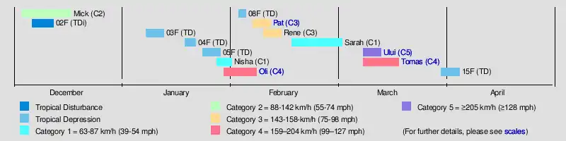 Tomas March 9–17 Category 4 severe tropical cyclone 185 km/h (115 mph) 925 hPa (27.32 inHg) Wallis and Futuna, Fiji $45 million 3 [37]