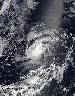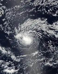 A tropical wave exited the western coast of Africa on June 19, which moved westward across the Atlantic without development. By June 29, the wave crossed Central America into the eastern Pacific. Thunderstorms increased over the next several days, which organized into curved rainbands around a developing low-pressure area on July 4. Following further organization, the system developed into a tropical depression on July 6, located roughly 435 miles (700 kilometres) south of Cabo San Lucas, Mexico. Soon after, it strengthened into Tropical Storm Blanca.[25] Operationally, the NHC classified the system immediately as a tropical storm. At that time, Blanca developed an eye-feature, though it was not expected to develop into a hurricane.[26] Steered by a ridge to the north, the storm moved west-northwestward throughout its existence.[25] Early on July 7, Blanca attained peak winds of 50 mph (80 km/h) and a barometric pressure of 998 mbar (hPa; 29.47 inHg).[25] The storm's convection developed into a central dense overcast over the center,[27] which soon began deteriorating, with cloud tops warming and convection shrinking.[28] By late on July 7, the center became devoid of shower and thunderstorm activity,[29] with only intermittent convection.[30] On July 8, Blanca weakened into a tropical depression, and the next day it degenerated into a remnant low. Although no longer a tropical cyclone, the remnants of Blanca maintained a well-defined low pressure center as it continued its northwesterly movement. Early on July 11, the system turned northward and gradually weakened. By the following day, Blanca had dissipated over open waters.[25]