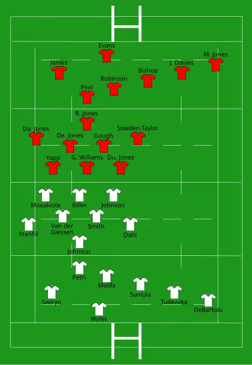 | Try: Tuilevuka 53' c Gagiano 80+1' m Con: DeBartolo 54' Pen: DeBartolo 13' | Report | Try: M. Jones 15' c J. Davies (2) 21' c, 78' c Penalty try 35' c James 62' c Cooper 70' c Con: Robinson (3) 15', 36', 64' James 22' Biggar (2) 71', 79' Pen: Robinson (2) 9', 11' |