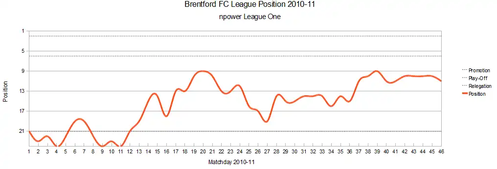 During the 2010–11 English football season, Brentford competed in Football League One. The mid-table season was memorable for runs to the final of the Football League Trophy and the fourth round of the League Cup.