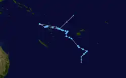 Early on February 13, RSMC Nadi reported that Tropical Disturbance 11F had formed about 65 km to the southwest of Port Vila in Vanuatu.[91] During the next day, the system gradually moved north and started intensifying.[92] Late on February 16, the disturbance turned south-southeast and intensified into a Tropical depression.[93] On the next morning, organization in the system improved, but the convection decreased unexpectedly.[94] Early on January 18, deep convection started developing over the Low-level Circulation Center (LLCC) which is very favorable for Tropical cyclogenesis.[95] Late on that day, the JTWC started monitoring the system as Tropical Cyclone 17P.[96] Early on the next day, RSMC Nadi upgraded the depression into a Category 1 Tropical Cyclone and named it Atu.[97] At midnight, that day, RSMC Nadi upgraded Atu into a Category 2 tropical cyclone,[98] and six hours later it was upgraded again into a Category 3 severe tropical cyclone,[99] and then again into a Category 4 Severe Tropical cyclone.[100] Though Atu strengthened rapidly, it weakened unexpectedly on the next day because of an eyewall replacement cycle.[101] Early on February 23, Atu crossed 25°S and entered TCWC Wellington's area of responsibility as a Category 3 Severe Tropical Cyclone.[102] Late on that day, the JTWC, reporting that the system was becoming extratropical, issued their final warning on Atu.[103] At midnight, that day, TCWC Wellington reported that Atu was no longer a Severe Tropical Cyclone.[104] Within six hours, TCWC Wellington downgraded Atu into a low, no longer considering it tropical.[105]