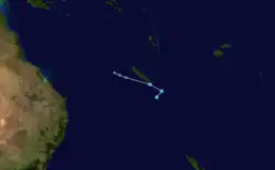 Late on January 21, RSMC Nadi reported that Tropical Disturbance 07F had developed about 570 km (350 mi) to the northwest of Nouméa, in New Caledonia.[64] During the next day the disturbance gradually organized further, with RSMC Nadi reporting that it had developed into a tropical depression later that day.[65] Early on January 22, RSMC Nadi released their final advisory on the tropical depression as it passed into TCWC Wellington's area of responsibility. Within hours of falling under their responsibility, Wellington declared the system as a low, no longer considering it tropical.