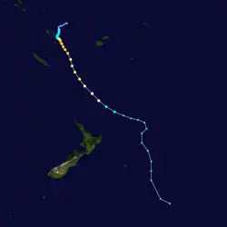 Early on February 5, RSMC Nadi reported that Tropical Disturbance 10F, had developed about 200 km (125 mi), to the south east of Nukualofa in Tonga.[79] During that day, the disturbance gradually organized further whilst moving towards the east. RSMC Nadi, then classified the disturbance as a tropical depression, later that day.[80] Intensification continued and on the next day, RSMC Nadi upgraded Tropical Depression 10F into a Tropical Cyclone and named it 'Zaka'.[81] Soon, Zaka crossed 25°S and TCWC Wellington took full responsibility of the Cyclone.[82] Hours later, the JTWC initiated advisories on the system and designated it with '12P'.[83] At midnight, that day, TCWC Wellington further upgraded Zaka into a Category 2 Tropical Cyclone.[84] Early on the next day, the system started weakening and became a Category 1 Tropical Cyclone.[85] Hours later, TCWC Wellington downgraded Zaka, into a low, no longer considering it tropical.[86] Late on that day, the JTWC, reporting that the system weakened rapidly, issued their final warning on the system.[87]