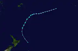 Early on January 19, RSMC Nadi reported that Tropical Disturbance 06F had developed within a trough of low pressure about 665 km (413 mi) to the northeast of Nadi, Fiji.[46] During that day convection surrounding the disturbance gradually became more organized before early the next day, RSMC Nadi reported that it had intensified into a tropical depression.[47] On January 22, The Joint Typhoon Warning Center (JTWC) started monitoring the system as Tropical Cyclone '08P'.[48] Later the same day, RSMC Nadi upgraded Tropical Depression 06F to a tropical cyclone and named it 'Wilma'.[49] Early on January 24, RSMC Nadi further upgraded Wilma to a Category 2 Tropical Cyclone.[50] Late on the same day, RSMC Nadi reported that Wilma had intensified into a Category 3 Severe Tropical Cyclone.[51] Wilma Continued to strengthen and January 26, the RSMC Nadi upgraded it into a Category 4 Severe Tropical Cyclone.[52] Early on January 27, Wilma entered TCWC Wellington's area of responsibility.[53] A few hours later, TCWC Wellington took full responsibility of Wilma, and downgraded it into a Category 3 Severe Tropical Cyclone.[54] Wilma Continued to weaken and TCWC Wellington further downgraded it into a tropical cyclone.[55] On January 28, the JTWC, issuing their final warning, reported that the system took a southeast curve along the coast of North Island, New Zealand and started becoming extratropical.[56] A few hours later, the TCWC Wellington, downgraded it into a low, no longer considering it tropical.[57]