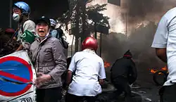 Sporadic clashes continued on 18 May, but these skirmishes were less intense than some previous confrontations had been.[44] The death toll rose to 39 as the day progressed, and it was widely believed that a military crackdown was imminent as troops and APC's gathered around the protest site urging residents and protestors to leave, declaring that a military operation was soon to commence.[45] The Army moved in soon afterward, backed by armoured personnel carriers (APC) and smashed through the protestors main barricades. Two Red Shirts were shot and wounded during the opening stages of this operation as other Red Shirts set alight the kerosene soaked barricades to deter advancing soldiers and obscure their view.[46]