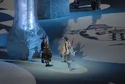 A Tribute to Northern Canada After Nelly Furtado and Bryan Adams had finished their performance, snow began to fall throughout the stadium. Performers, dressed in winter clothes representing native and a variety of immigrant groups, walked about and mingled on the stage floor. Their leader took his staff and banged it on the ground, producing waves of light rippling on the floor. The northern lights and different constellations of animals appeared. A giant, sparkling puppet (one of the largest puppets ever created) of a spirit or Kermode bear that rose from the stadium floor, and hovered over the performers, who were standing on a simulated ice floe.[16][17][18] After a few seconds, the ice began to break up, and the performers "floated" to the edge of the stage, where they disappeared.[19] The ice breaking away gave way to a huge arctic sea, where simulated whales swam while breathing until next transition.