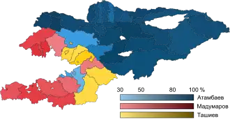 Former Prime Minister Atambayev won the presidential election by a large margin in the first round and became the new President of Kyrgyzstan.[2] Over 60% voter turnout was recorded.[12]