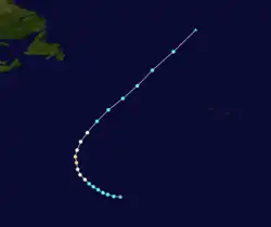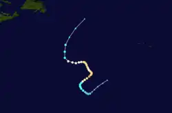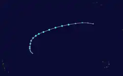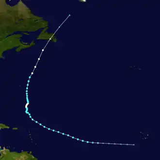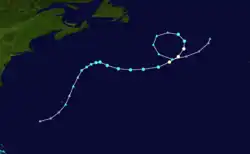 There were only two tropical cyclones that formed in September, though three systems that existed in that month originated in August.[18] Michael became the first major hurricane of the season on September 6, when it peaked as a Category 3 hurricane.[26] Hurricane Nadine developed September 10 and became extratropical on September 21. However, Nadine re-developed on September 23 and subsequently lasted until October 3. With a total duration of 24 days, Nadine was the fourth-longest lasting Atlantic tropical cyclone on record, behind the 1899 San Ciriaco hurricane, Hurricane Ginger in 1971, and Hurricane Inga in 1969.[27] In October, there were five tropical cyclones – Tropical Storms Oscar, Patty, and Tony – as well as Hurricanes Rafael and Sandy.[18] This was well above average, yet not record, activity for the month of October.[28] Hurricane Sandy outlived the final named storm, Tony, and became extratropical on October 29, ending cyclonic activity in the 2012 season.[18]