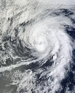 A large area of low pressure well west of Central America formed on August 29. Over the next couple of days, the system began to slowly organize as it was in an area of favorable conditions for further development.[35] By September 1, another area of low pressure had formed just offshore Mexico, just east of the organizing low, and that same day it eventually absorbed the weaker low; this gives an extra hint for the formation of Tropical Depression Ten-E, which was south of Baja California.[36] The next day, the depression became the tenth storm of the 2012 season; however, no significant strengthening was anticipated because of moderate to high vertical wind shear in addition to the marginally warm sea surface temperature along John's path.[37] John remained a very weak tropical storm; it never exceeded 40 mph winds throughout its lifetime, and the main low level circulation was always separated from the main canopy of thunderstorms due to the increasing easterly wind shear.[38] It only maintained tropical storm intensity for 18 hours; after that it weakened to a tropical depression.[39] It held onto tropical depression status for another 18 hours, before becoming post-tropical on the following day.[40] However, the remnant low of John continued moving northwestward for the next 3 days, before dissipating on September 7.[41]