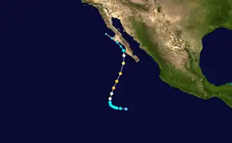 On September 9, an area of low pressure formed west of Central America. The disturbance was expected to strengthen within the next couple of days, with conditions conducive for development.[43] During the next several days, the low edged a little close towards the coast of Western Mexico, but interaction with land did not inhibit further development of this area of low pressure into the eleventh tropical depression of the season.[44] The depression then became Tropical Storm Kristy that same day. The system was insistent on maintaining its intensity even though structure and organization began to collapse because of the unfavorable environment it encountered.[45] September 16, Kristy was downgraded to a tropical depression, and was declared post-tropical the following day, as from a lack of deep convection. The following day, wind warnings were placed in effect for the Baja California Peninisula from the remnants associated with Kristy.[46] Kristy also threatened Southern Mexico.[47] During the next several days, Kristy's remnants turned towards the east before looping back towards the south, until the system dissipated very early on September 20.[48]
