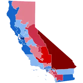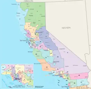 This was the first election using congressional districts drawn by the California Citizens Redistricting Commission. The districts, based on the 2010 United States census, were approved on August 15, 2011.[3] It was also the first non-special election to use the nonpartisan blanket primary system established by Proposition 14. As a result, eight districts featured general elections with two candidates of the same party: the 15th, 30th, 35th, 40th, 43rd, and 44th with two Democrats; and the 8th and 31st with two Republicans.