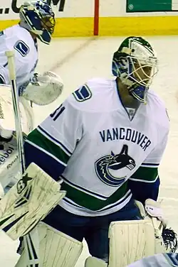 The Canucks had two competitors for the back-up goaltender position, Eddie Lack and Joacim Eriksson.[31] Lack had been seen as the heir apparent for the back-up role, but following a season-ending injury after playing only 12 games in the AHL, his future was called into question.[32] Eriksson was signed to a two-year, two-way, entry-level contract with the Canucks in the off-season after helping Skellefteå AIK to the Swedish Hockey League championship.[33][34] Though neither player had any NHL experience, Lack was seen as the front runner because of his one-way contract, which paid him the same at the NHL or AHL level.[35]