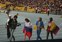 In the final, Saladuha took the first round lead, with Knyazyeva-Minenko leading a crowd of four hovering around 14.30. In the second round, the event was decided. First the home team's Ekaterina Koneva put one out at 14.81 to take the lead. Two jumps later, Ibargüen improved on her world leading jump of the year by going 14.85, just 4 cm further. Two jumps after that, Saladuha improved out to 14.65. That turned out to be it, but nobody knew it. Ibargüen continued with a 14.83 in the fourth round, which turned out to be the second best of the competition and watched nervously as Koneva tickled her best with a 14.79 in the fifth. But the lead held up and Ibargüen took home Colombia's first World Championship gold medal to go along with the bronzes she and racewalker Luis Fernando López earned in Daegu.[2][3]