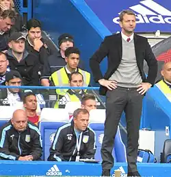 On 14 February 2015, the club's official Twitter page announced the appointment of Tim Sherwood as new manager.[5][6] Sherwood attended the following day's 2–1 win over Leicester City in the FA Cup and gave a half-time team-talk, his first game in official control of the team was at home to Stoke City almost a week later. Villa lost the game 2–1 after a 93rd-minute penalty from Victor Moses.[7][8] After also losing his second game in charge, this time going down 1–0 to Newcastle United, Sherwood's first win came on 3 March 2015 against West Midlands rivals West Bromwich Albion. The game finished 2–1, with Christian Benteke scoring a last-minute penalty, which shadowed the decision that went against Villa in the Stoke game.[9][10] Sherwood led Villa to Wembley for the first time since 2010 just four days later, after winning 2–0 in the FA cup quarter-final again against West Bromwich Albion.[11][12] Sherwood then led Villa to a third straight win, a 4–0 away win over relegation rivals Sunderland in which all goals were scored in the first half.[13] On 19 April 2015, Aston Villa reached the FA Cup Final for the first time since 2000, coming from behind to defeat Liverpool 2–1 in their semi-final at Wembley.[14] However, they went on to lose the final 4–0 to Arsenal.[15]