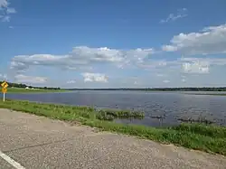 With excess spring flows on the Assiniboine River directed towards Lake Manitoba through use of the Portage Diversion, lake levels were above the desirable range of the lake of 810.0 to 812.0 feet above sea level (ASL) and even the upper limit of 813 feet ASL prior to the summer flood.[14][15] Continued use of the Portage Diversion occurred after it was re-opened to help mitigate against flooding, during which flows of over 34,000 cfs were directed towards the lake, well above the original designed channel capacity of the Portage Diversion of 25,000 cfs.[16][17] During the 2011 as well as the 2014 floods, work was done on the Portage Diversion to allow it to convey the higher volumes experienced. The result of this was that the water level of Lake Manitoba peaked at 814.6 feet putting residents on the lake at risk of flooding and damage from wind events.[18]