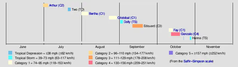 Tropical cyclogenesis commenced with the development of Arthur on July 1. The system intensified into the first hurricane of the year early on July 3. Both events occurred ahead of the respective long-term climatological average date: July 9 for first named storm, and August 10 for first hurricane.[24] Later that month, a tropical depression developed over the eastern Atlantic, but dissipated after only two days. There were also two tropical cyclones in August, with the development of hurricanes Bertha and Cristobal. Despite being the climatological peak of hurricane season, only two additional systems originated in September – Tropical Storm Dolly and Hurricane Edouard. In October, three storms developed, including hurricane Fay and Gonzalo and Tropical Storm Hanna.[25] The most intense tropical cyclone – Hurricane Gonzalo – peaked with maximum sustained winds of 145 mph (235 km/h) on October 16 which is a Category 4 on the Saffir–Simpson hurricane wind scale. It was the first Category 4 hurricane since Hurricane Ophelia in 2011.[26] The final tropical cyclone of the season was Hanna, which dissipated on October 28.[25]
