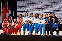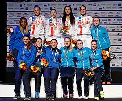 Podium of the women's team sabre: Russia, France, and Ukraine