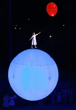 The opening ceremony focused heavily on classical music and large scale productions.[7] Performances journeyed through Russian history through the eyes of a little girl called Lyubov ("Love"), played by Liza Temnikova, touching on Russia's art, music, and ballet.[14] The Russian history presentation was ushered in by a brightly-lit troika of three horses followed by a red sun. Performances included the building of St Basil's Cathedral, represented by colourful inflatable sculptures,[16] and 17th century czar Peter the Great building an army as Russia transitioned from medieval times to the 20th century.[17] Czar Peter's marching cadets (160 male dancers) moved from a map of the St Petersburg projected on the stadium floor to an imperial ball inspired by Leo Tolstoy's War and Peace, and featuring ballet dancers including Danila Korsuntsev, Ivan Vasiliev, and Svetlana Zakharova.[18] The ball included music by Aleksander Sergeyevich Zatsepin and ended with the fifth movement (Rondo) of Alfred Schnittke's Concerto Grosso No. 1.[19]