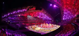 Many performers wore white to symbolise peace. More than 3,000 performers and 2,000 volunteers took part in the show.[14] 10,000 people in all helped organise and execute the ceremonies. 120 projectors and 2.6 million lumens turned the stadium floor into a 3D, moving landscape.[11]
