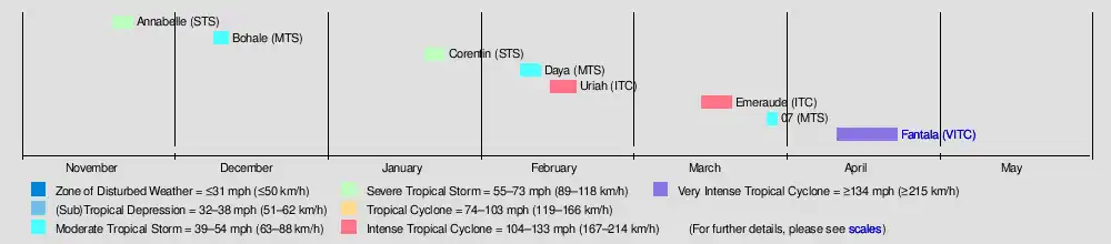 The season started on November 19, with the formation of Annabelle.[4] After a month of inactivity, Bohale formed, but was fairly weak and only reached moderate tropical cyclone strength.[5] Another month passed before Corentin formed on January 20.[6] In February, the basin became somewhat active with Daya forming,[7] and Uriah entering the basin days later.[8] Emeraude formed in March, quickly peaking at intense tropical cyclone strength, before quickly weakening.[9] Moderate Tropical Storm 07 formed at the end of March.[10] In April, the season began to wind down. Very Intense Tropical Cyclone Fantala formed near the end of the month, and reached peak intensity as the strongest tropical cyclone recorded in the basin in terms of sustained winds. Fantala dissipated on April 23, ending the season.[11]