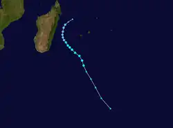 A low-pressure area developed within a monsoon trough over the Mozambique Channel on February 1.[24] It tracked southeastward, crossing Madagascar and becoming a tropical disturbance 380 km (235 mi) north of Saint-Denis, Réunion on February 8.[7] The disturbance began to travel generally southwestward, intensifying slowly. The next day, the system turned southeast under the influence of a ridge to its east and a cut-off low to the southwest.[25] On February 11, the system was classified as Moderate Tropical Storm Daya, while located about 545 km (340 mi) south-southwest of Saint-Denis.[7] Daya accelerated to the southeast under the influence of the ridge and favorable poleward divergence allowed the system to peak with maximum sustained winds of 65 km/h (40 mph) early the next day.[25][7] Daya quickly met strong wind shear, which led to its transition into a post-tropical depression on February 12.[26] Météo-France ceased monitoring post-tropical Daya the following day.[7]