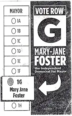 A campaign flyer distributed near a voting station during the general election encouraging voters to vote for Mary-Jane Foster