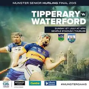 The 2015 Munster Senior Hurling Championship final was a hurling match which was played on 12 July 2015 at Semple Stadium, Thurles. The winners would advance to the semi-finals of the All-Ireland Senior Hurling Championship, with the loser going into the All-Ireland quarter-finals. Tipperary and Waterford contested the final, with Tipperary winning the title on a 0-21 to 0-16 scoreline.[2] The win was Tipperary's 41st Munster Senior title and first since 2012.[3][4][5][6]