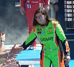 The race restarted with 10 laps to go. While Hamlin was unable to pull away from the field as had been the norm in the last few years, he was able to hold off a hard charging Kevin Harvick to score the victory in the Sprint All-Star Race.[25] It was the fifth straight year that the winner of the race restarted either first or second in the final 10 laps.[26] "In the middle part of the race, I thought we were out to lunch," Hamlin said. "With 50 (laps) to go, I didn’t see this coming. But the pit crew knocked it out of the park – a primetime, under-pressure performance that won us the race. Then, we had to hold off the "4" (Harvick), which we haven’t been able to do the last two years. Everything came together perfectly for that last 10 laps."[27] Jeff Gordon finished fourth in his 22nd and final All-Star Race.[28] Kyle Busch finished sixth in his first Sprint Cup Series race since Homestead last November.[29] "I felt like I got of the car after 100 laps and I'm fine," Busch said. "Am I going to die out after 200 or 300? I don't know, but the plan is to the full distance."[29] After restarting the race from the tail-end of the field, Brad Keselowski worked his way to a ninth-place finish.[30]