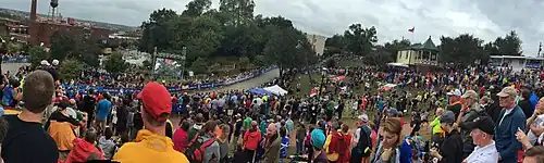 The women rode eight laps on the road race circuit. The length of the circuit was 16.2 km (10.1 mi) and had a total elevation of 103 meters (338 feet). All road races took place on a challenging, technical and inner-city road circuit. The circuit headed west from Downtown Richmond, working its way onto Monument Avenue, a paver-lined, historic boulevard that's been named one of the "10 Great Streets in America". Cyclists took a 180-degree turn at the Jefferson Davis monument and then maneuvered through the Uptown district and Virginia Commonwealth University. Halfway through the circuit, the race headed down into Shockoe Bottom before following the canal and passing Great Shiplock Park, the start of the Virginia Capital Trail. A sharp, off-camber turn at Rockets Landing brought the riders to the narrow, twisty, cobbled 200 meters (660 feet) climb up to Libby Hill Park in the historic Church Hill neighborhood. A quick descent, followed by three hard turns led to a 100 meters (330 feet) climb up 23rd Street. Once atop this steep cobbled hill, riders descended into Shockoe Bottom. This led them to the final 300 meters (980 feet) climb on Governor Street. At the top, the riders had to take a sharp left turn onto the false-flat finishing straight, 680 meters (2,230 feet) to the finish.