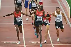 The process of running rounds in the 1500m tends to select strategic experts because nobody would want to run hard three times in four days as this schedule would require. Since 2008 (excepting that bad race at the 2012 Olympics), the expert in this has been two-time defending champion Asbel Kiprop. But in case anybody wanted to run fast, Kiprop also left a message at the fastest race of the year in Monaco, where he blew away many of the members of this field by almost 2 seconds in his near miss of the world record. What makes Kiprop so dangerous is his ability to accelerate from the back of the field and in the final that is exactly where he went. Was he hiding or just waiting to pounce? With three other Kenyan teammates making it to the final, there was talk about a potential sweep. Timothy Cheruiyot and Elijah Motonei Manangoi took the race through an honest first two laps in 1:58.62. Only Aman Wote ran aggressively with them at the front, the other tacticians lining themselves up for the finish. Matthew Centrowitz, Jr. was the first to move forward as they came through for the bell. With 300 metres to go, Olympic champion Taoufik Makhloufi made his move, identical to the Olympics, Kiprop near the back of the pack beating only two Americans and boxed by Wote. Over the next 100 metres, Makhloufi opened a lead chase by Abdalaati Iguider. Kiprop slowed down to get out of the box, then ran around Wote out to lane 3. The tall Kenyan was now clearly moving faster than the rest of the field he was passing on the outside. As Kiprop swept past the field after the North African duo, only Silas Kiplagat came with him, these four breaking from the rest. As Kiprop caught Iguider, he reacted and ran even with Kiprop up to Makhloufi. With 50 metres to go, it was three abreast across the track with Kiplagat chasing Kiprop on the outside less than two metres back. Kiprop broke past the two North Africans and ran on to victory, while Iguider edged ahead of a spent Makhloufi. Out of nowhere (actually a distant fifth place) came sprinting Manangoi, faster than any of the leaders, drifting out to lane 3 for clear sailing. Passing three people in the last 10 metres, Manangoi crossed the finish line just ahead of a desperately diving Iguider to take silver, Iguider doing a full face plant to the track across the finish line holding on to bronze.[3]