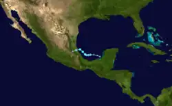 The precursor to Earl brought heavy rain and gusty winds to the Lesser Antilles and Greater Antilles. Strong winds in the Dominican Republic downed a power line onto a bus, subsequently causing a fire that killed six people. A boat crash in Samaná Bay killed seven people.[54][55] Significant impacts were reported in Belize after Earl moved ashore as a hurricane, including downed trees and power lines, blown transformers, damaged or ripped-off roofs, coastal and inland flooding, and a significant storm surge.[56] About 2,000 homes were damaged or destroyed throughout Belize.[57] Damage in the country reached about $110 million. In Mexico, flooding and landslides resulted in severe damage and many deaths, especially in Puebla and Veracruz. In the former, mudslides damaged hundreds of homes, including 350 in the village of Chicahuaxtla alone. Huauchinango observed a month's worth of rainfall in only about 24 hours, resulting in mudslides that killed at least 13 people. Throughout Puebla, there were at least 41 deaths. In Veracruz, Earl and the resultant landslides damaged about 6,300 homes and 26 roadways, while 13 fatalities occurred. Overall, Earl left $132 million in damage and 81 fatalities in Mexico, with 10 other people missing.[27]