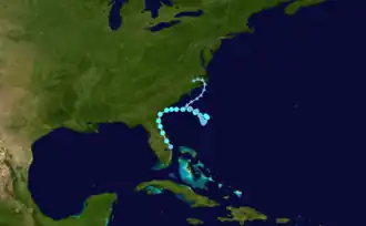 A broad low pressure developed on August 26 as a frontal boundary stalled near Bermuda and weakened. Early on August 27, the low became well-defined, but lacked sufficient convection,[67] and was plagued by unfavorable conditions such as dry air and moderate wind shear.[68] However, a large burst of convection near and to the west of the center prompted the upgrade to Tropical Depression Eight at 12:00 UTC on August 28 about 350 mi (560 km) southeast of Cape Hatteras, North Carolina.[67] A ridge to the north steered the depression westward into an area of moderate wind shear.[69] Late on August 28, the center became exposed from the convection,[70] but convection increased again after about 24 hours.[71] As it approached the Carolina coastline on August 30, a weakness in the subtropical ridge caused the depression to slow down and turn northward; its closest approach to the United States was 60 mi (95 km) south-southeast of Cape Hatteras later that day. The depression then turned eastward in response to becoming entangled in the mid-latitude westerlies. As it accelerated, the circulation began to become elongated. The depression degenerated into a trough of low pressure by 00:00 UTC on September 1. The remnants were absorbed into a frontal system on September 2.[67]