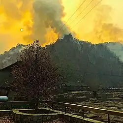 On November 28, the Chimney Tops 2 fire in the Chimney Tops of the Great Smoky Mountains National Park spread with the aid of strong winds and dry conditions, the fire quickly broke into multiple fires and spread across the mountains above and around Gatlinburg. By the evening hours the fire had reached the downtown area of Gatlinburg, resulting in the evacuation of over 14,000 people, along with causing damage in and around the town.[21] By November 29, the wildfires had claimed at least three lives.[22] An additional four people were later confirmed dead the next day.[23] The Chimney Tops 2 fire had burned 17,006 acres.[12] A total of 14 people died and 134 others were injured in the Smoky Mountains fires, while over 2,400 structures were burned. Damages were totaled to over $500 million.[12][24]