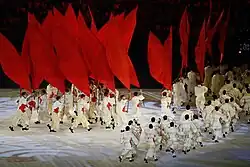 After a burst of fireworks, the Olympic flag then entered the stadium, and was raised while the Olympic Anthem was sung in English by the More Project Youth Choir.