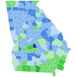 Incumbent Senator Johnny Isakson won re-election to a third term in office by a wide margin.[2] He later resigned from the Senate on December 31, 2019, due to health issues. As of 2024, this remains the last time Republicans won a Senate election in Georgia, as well as the last time that suburban Gwinnett and Henry counties have voted Republican in a statewide election. It also remains the last time that any statewide candidate has won an election in Georgia by double digits, and the last time that any U.S. Senate candidate in Georgia has won without a runoff. This is the also the last United States Senate election in Georgia in which the winning candidate won a majority of counties.
