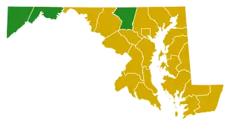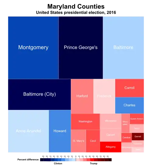 Clinton won Maryland with 60.3% of the vote, while Trump received 33.9%.[3] Maryland was among the eleven states (and the District of Columbia) in which Clinton improved on Barack Obama's 2012 raw vote total, although by just 84 votes.[4] Maryland was one of four states in which Clinton received over 60% of the vote, the others being Massachusetts, Hawaii, and California. However, Maryland was the only one of those eleven states to have voted more Democratic in both 2012 and 2016. In this election, Maryland voted 24.32% to the left of the nation at-large.[5]