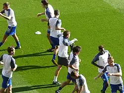 Leicester City players warming up before a Premier League match Manchester United in August 2017