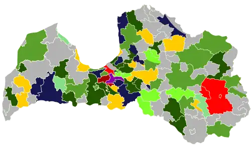 The following map shows the results of the local elections in different territories of Latvia. The colour, which each territory has, indicates the party, which received the majority of votes in this territory.
